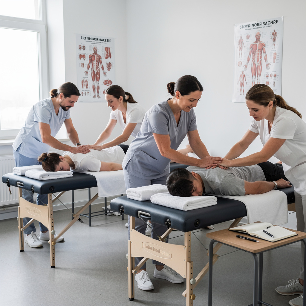 A hands-on relaxation massage training session in a professional classroom setting.
